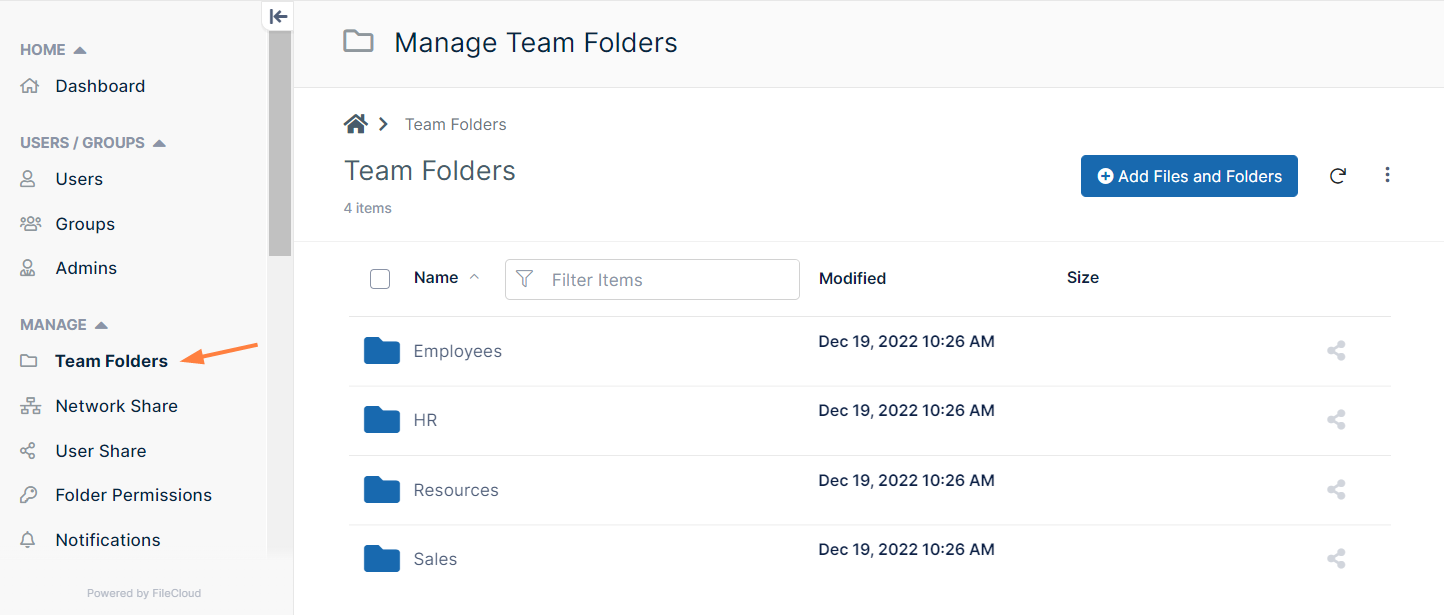 Team Folders are an easy way to share files and folders among a team. When you begin the FileCloud Online trial, a Team Folders account and four Team Folders have already been set up for you.