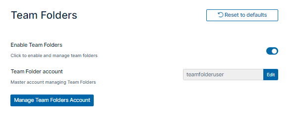 In the FileCloud admin portal's left navigation bar, scroll down and click Settings.Then, on the Settings navigation page, click Team Folders. The Team Folders settings page opens. Enable Team Folders is checked, and the Team Folder Account is set up for you with the user teamfolderuser.