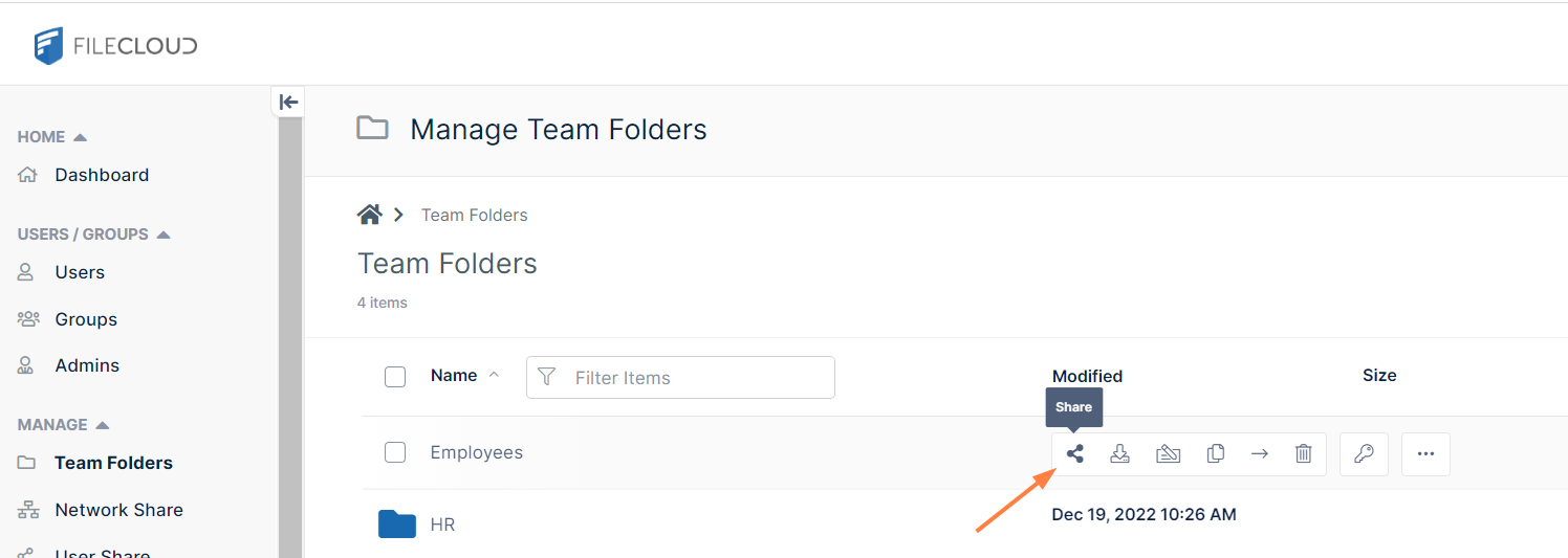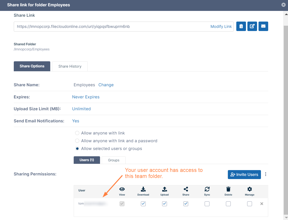 Hover over any of the Team Folders, and click the share icon: A Share link for folder dialog box opens and shows you which users the Team Folder are shared with and what their access to the folder is. The only user with access to the Team Folders when you begin using the FileCloud trial is your user account. demouser has not been given access to the Team Folders.