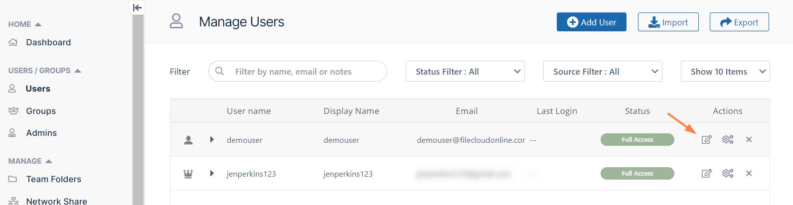 User accounts let employees in your company access the FileCloud Online user site so they can share and sync files. When you begin the FileCloud Online trial, two user accounts have been added to the system for you: your user account and the demouser user account.