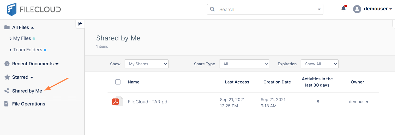Click Shared by Me. The file shared by demouser, FileCloud-ITAR.pdf is listed on the screen.