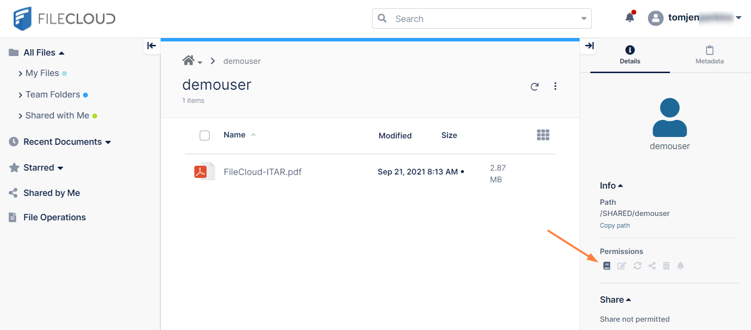 In the Shared with Me screen, click demouser. The file shared with you by demouser, FileCloud-ITAR.pdf, appears. If you look in the Details tab of the right panel, you can see that the only permission you have for this shared file is view/download.