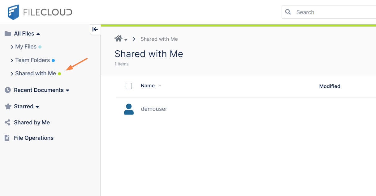 In the navigation panel, click Shared with Me. In the Shared with Me screen, demouser is listed. Any other users who shared files with you would also be listed.