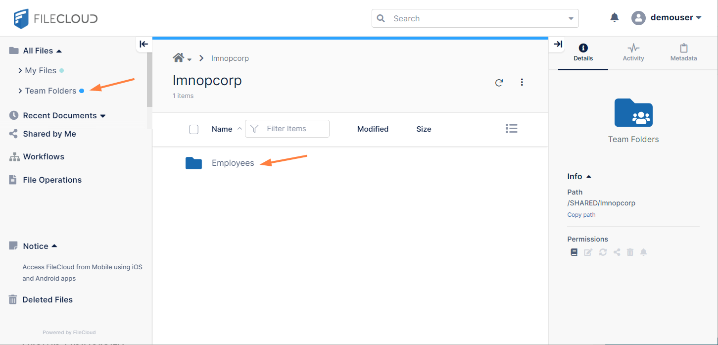 Check the boxes in the listing for demouser to give the user permissions to the Team Folder.