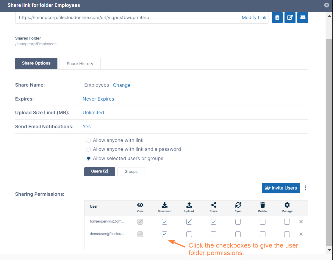 In the Share link for folder dialog box, click Invite Users and add find demouser in the search box.