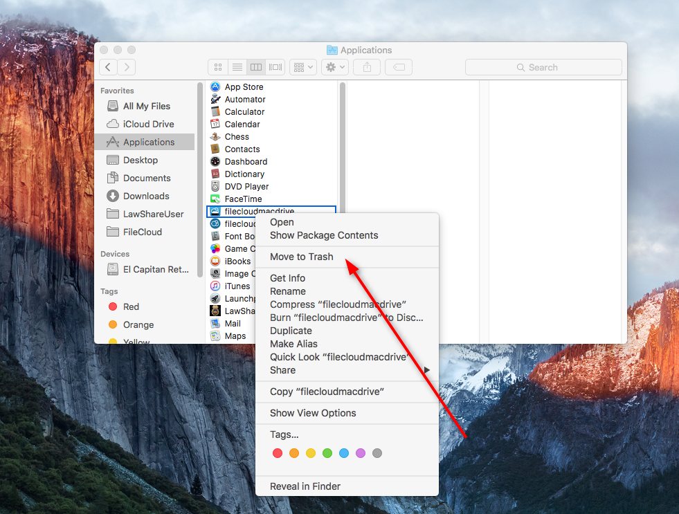 Then navigate to Applications, select Filecloud Drive for Mac and click Move to Trash.