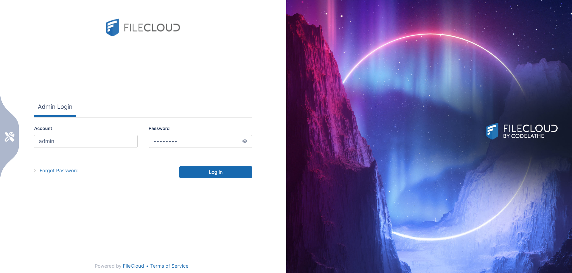 Type in the user name and password provided in the welcome email sent by FileCloud or the Admin name and password.