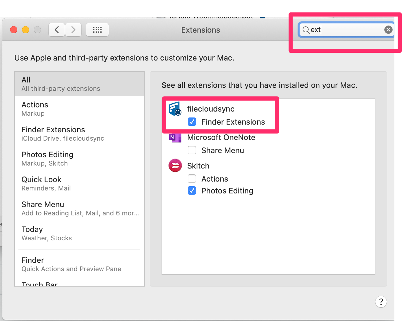 - Search on extensions, and enable Finder Extensions for filecloudsync.