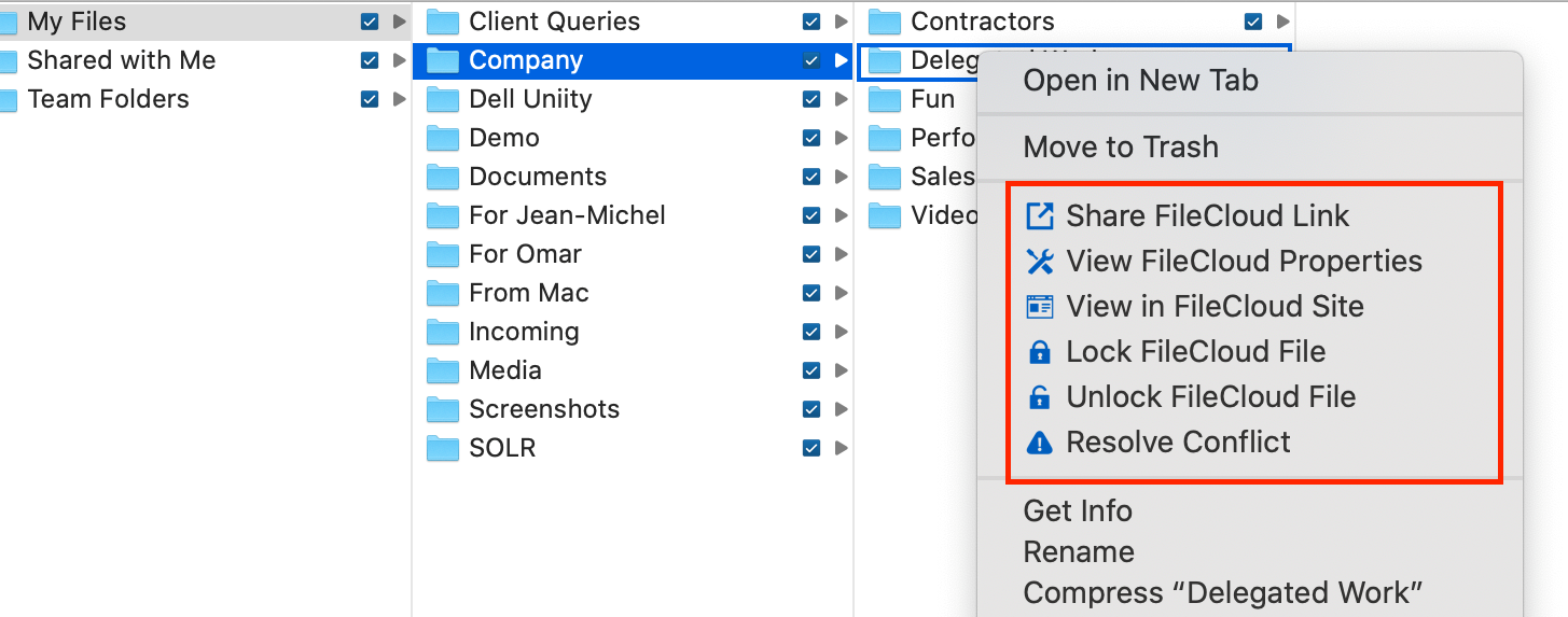 Now when you go to the Sync folder in the Finder, icons appear to the right of files and folders, and FileCloud Sync options appear in the right-click menu.