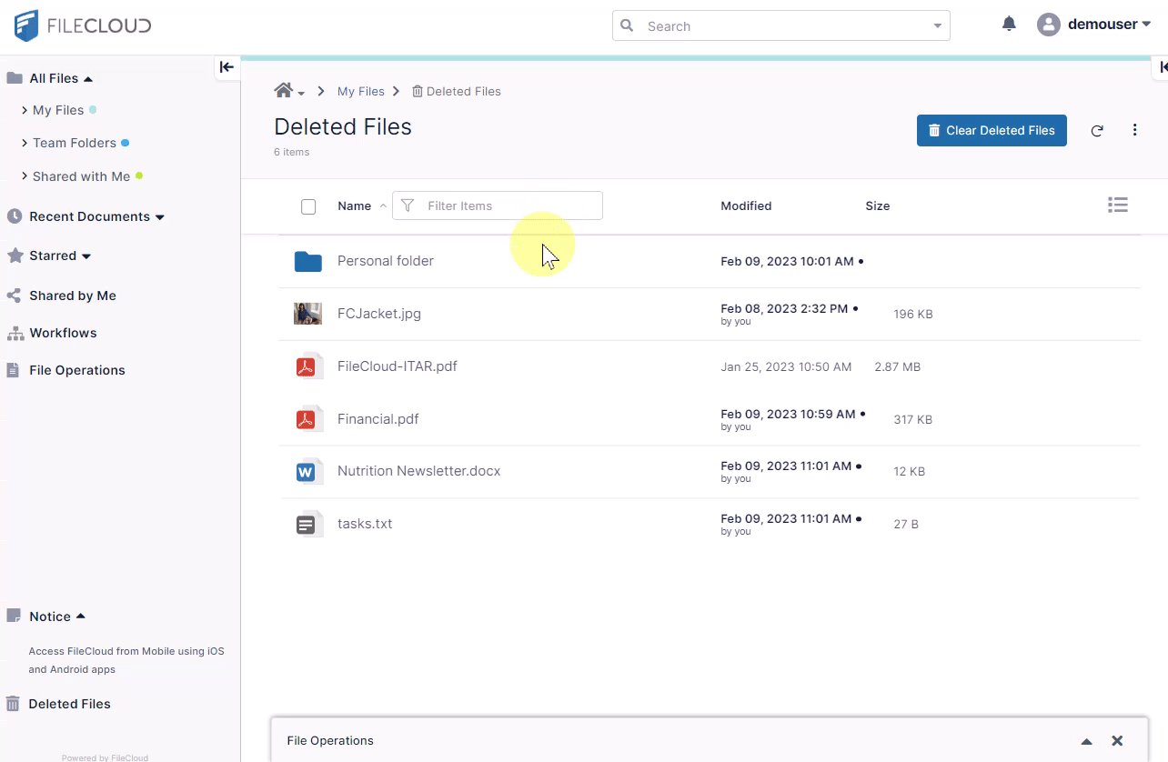 - Above the list of files, click Clear Deleted Files.