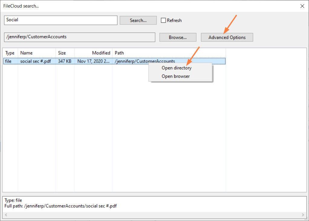 Right-click a result, and choose Open browser to open it in the FileCloud user portal.