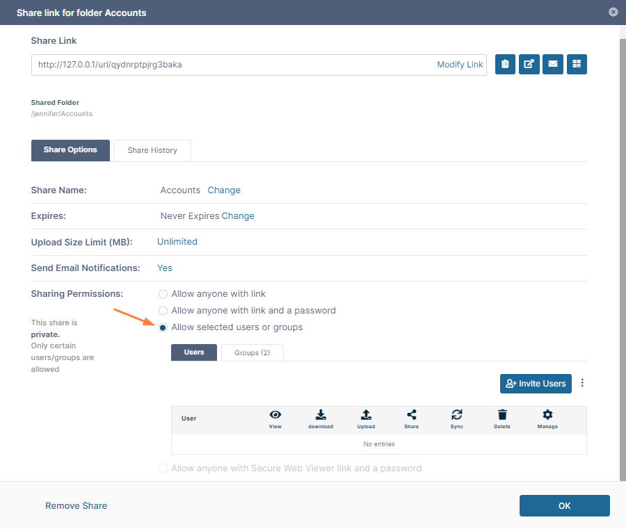 - Click Add Users to this Share.