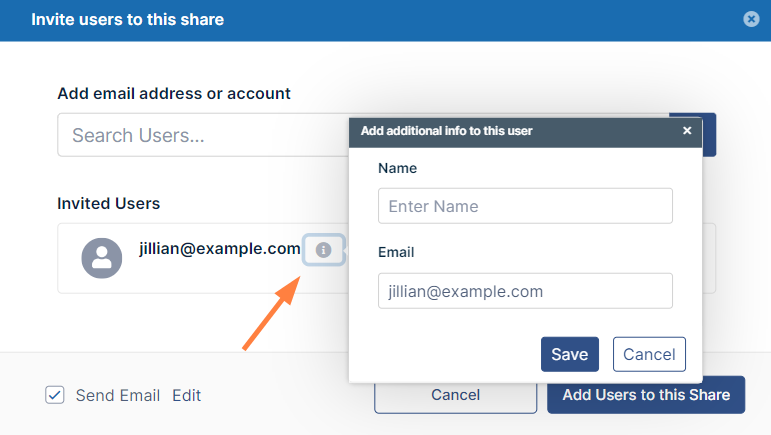 - Enter the requested information and click Save, then click Add Users to this Share again.
