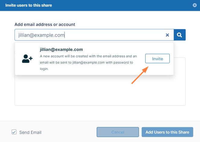 - Enter the new user's email address, invite them to the share, and then send them an email with a link to create an account.