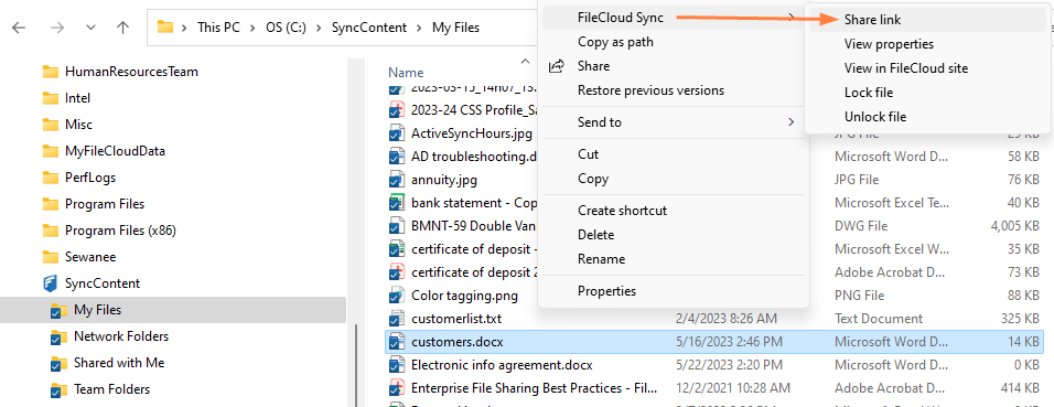 2. Navigate to the file or folder you want to share, then right-click on it and choose Show More Options. In the next menu choose FileCloud Sync > Share Link.