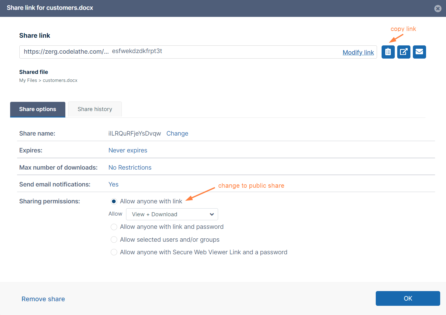 • Under Share options you can change the share to Allow anyone with link.