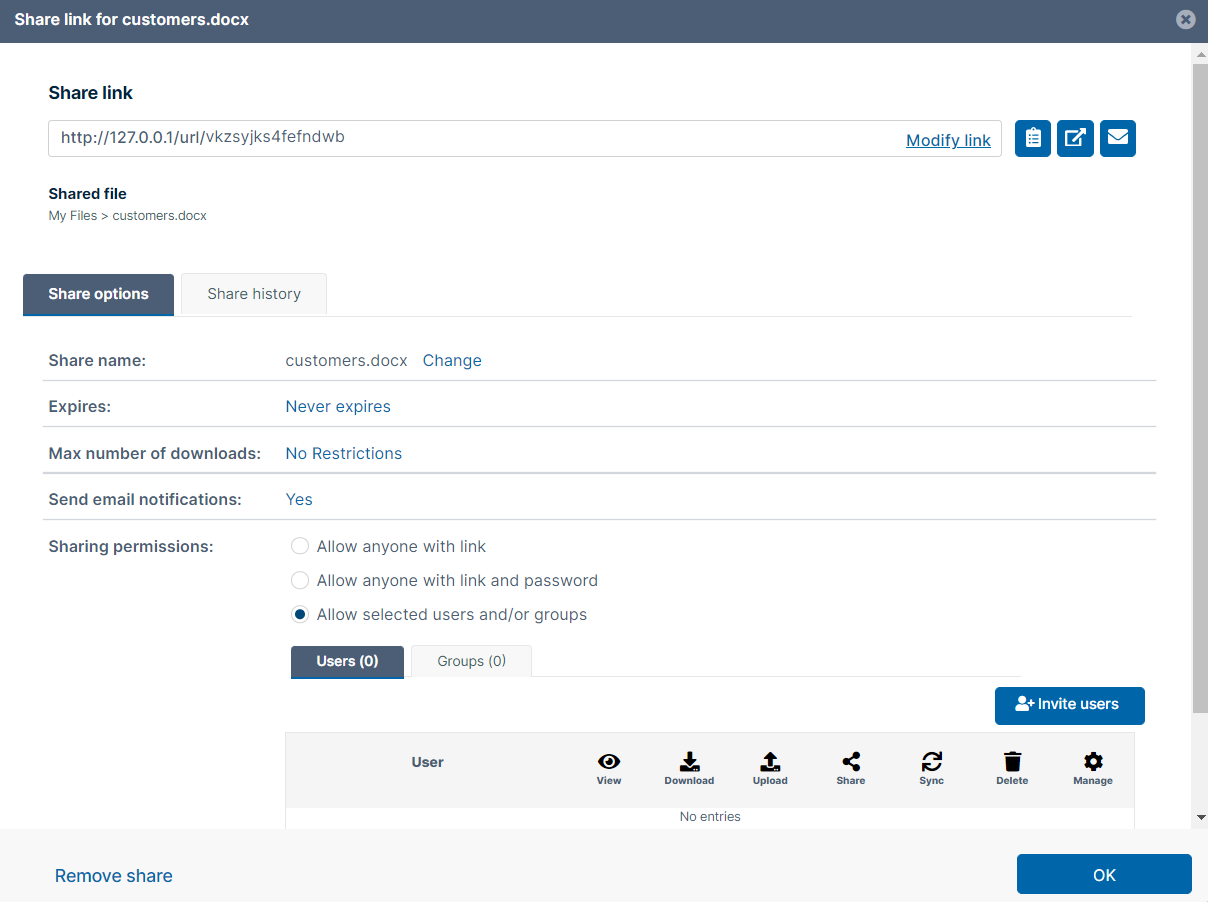 Share the file using the same settings and options that you would for a share in the user portal. See Sharing Files and Folders for help. Note: The option for downloading the share QR code, which is available for shares created from the user portal, is not available for shares created in FileCloud for Office. After you have shared the file, the FileCloud for Office panel displays details of the share: