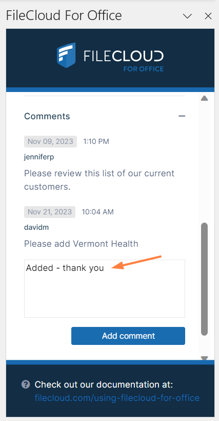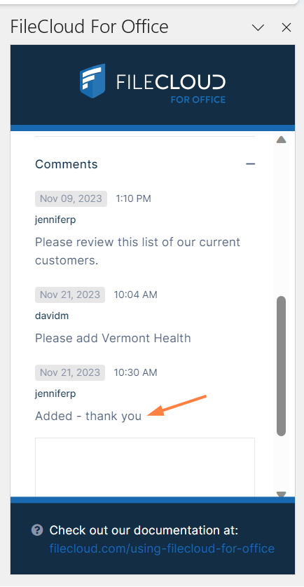 FileCloud for Office is an MS Office add-in for Word, Excel, and PowerPoint which can be used in both Windows and macOS with FileCloud Sync, FileCloud Drive, and FileCloud Desktop. It is available in FileCloud beginning with version 23.1.