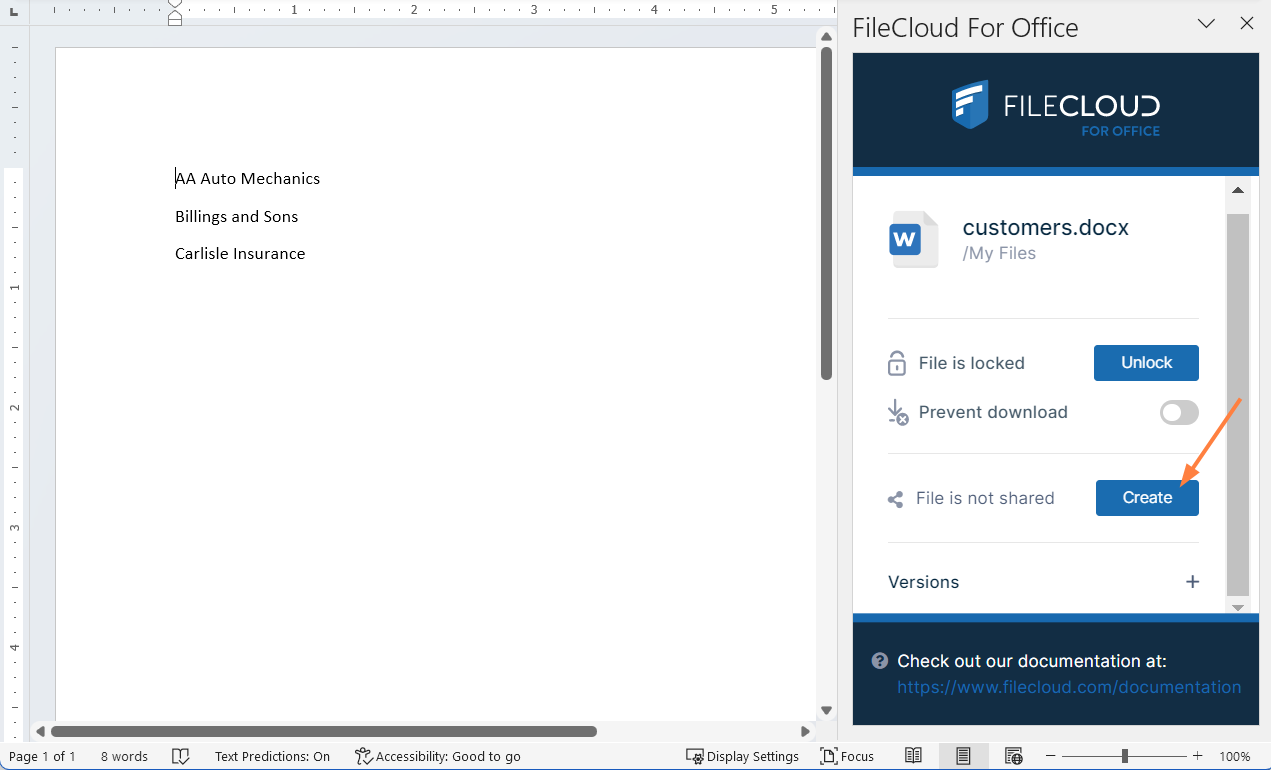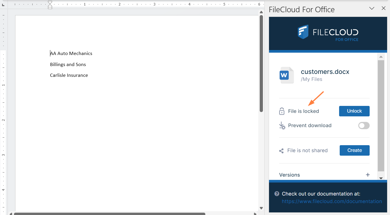 If a shared file is not locked when you open it for edit, another user can also open the file and make changes. To avoid this, by default, FileCloud for Office automatically locks files for editing when they are opened. When you open an Office file in your client directory, the FileCloud for Office panel shows File is locked, and by default, users are allowed to download or read the file (Prevent download is disabled).