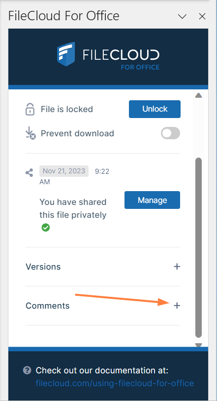 At the bottom of the FileCloud for Office panel, click the + across from Versions. The expanded Versions section shows you version information about the file.
