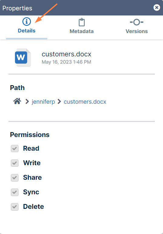 Click the Details tab. The details shown are the filename and type, the last modified date, the path of the file in FileCloud, and your permissions for the file.