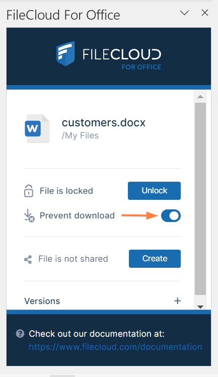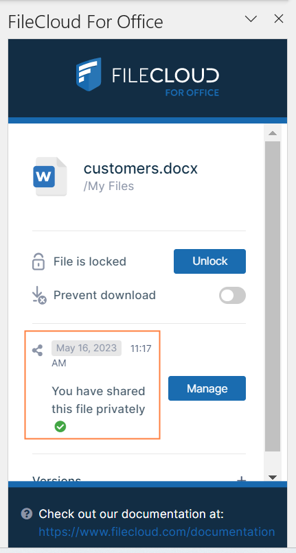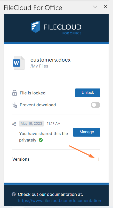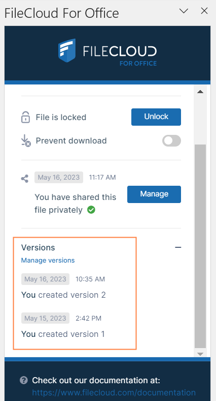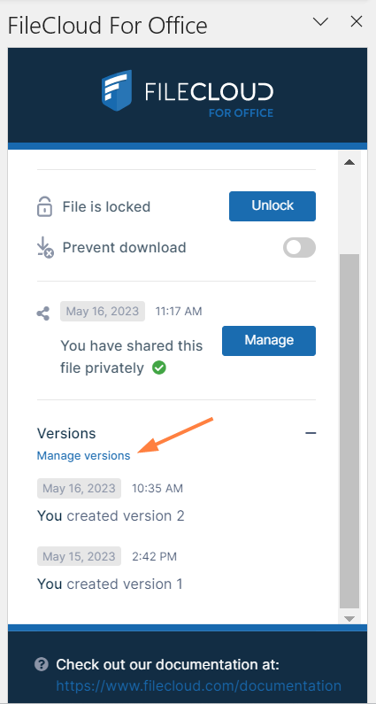 In the Versions section of the FileCloud for Office panel, click Manage versions.