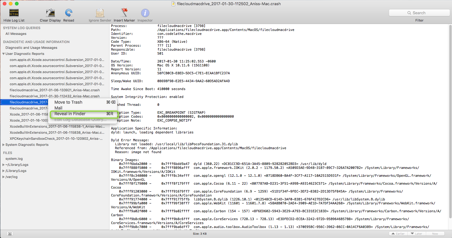 4. Right click the report and select "Reveal in Finder" and email that file.