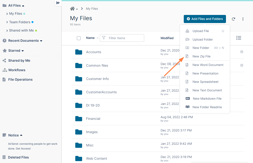 - Click Add Files and Folders, and choose Upload File, Upload Folder, or New Folder.