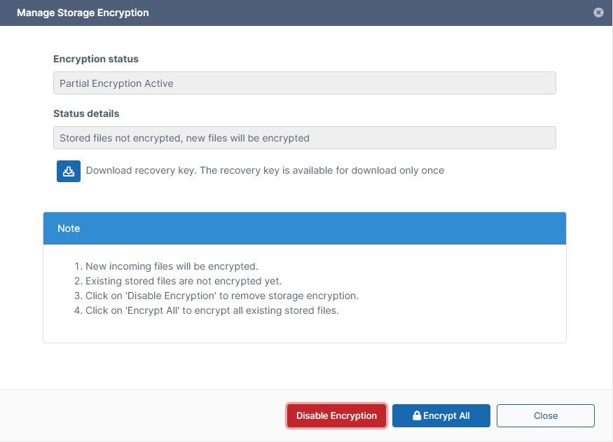 The following screen appears. - Click the Download recovery key button and save the recovery key file.