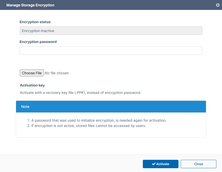 - Then click Activate to activate storage and encryption.