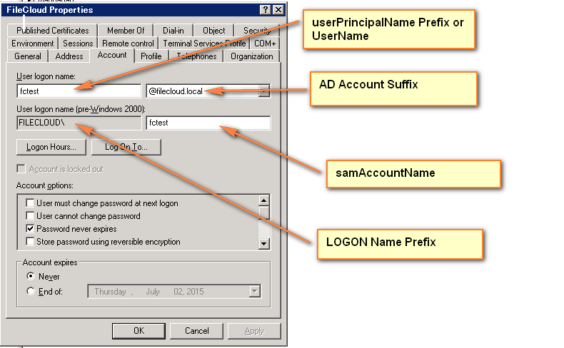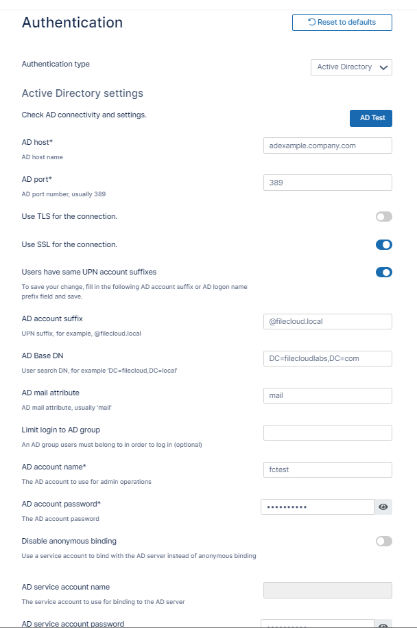 | Active Directory users | Must have an email attribute FileCloud username must match AD user login name Important: The FileCloud username cannot be changed. | Beginning in FileCloud 21.2, the AD Account name used in Active Directory settings must have an email ID in Active Directory. The email address is saved in the user's FileCloud profile. During login, validation requires the FileCloud email address and the AD email address to match; later modification of email address in AD or FileCloud will cause login to fail. |