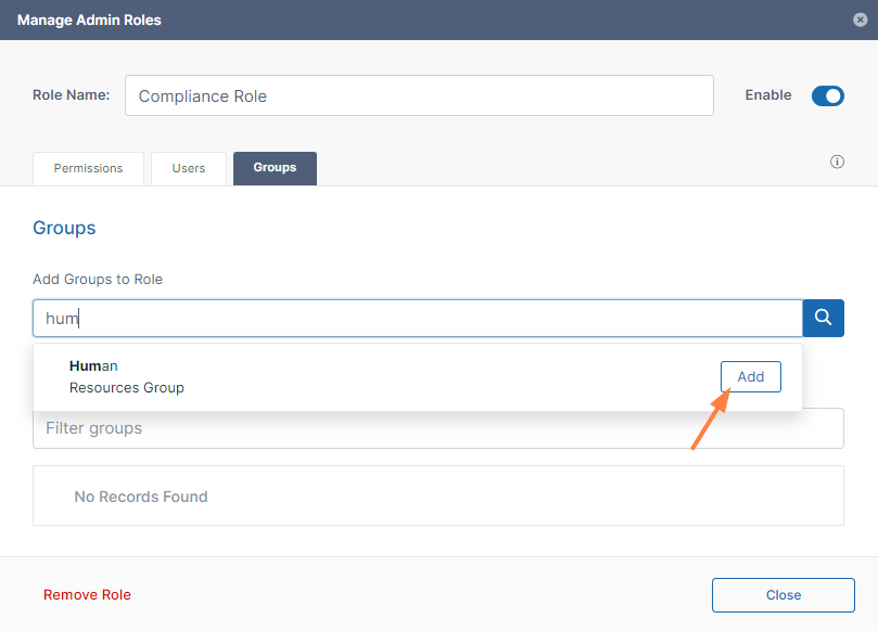 In Add Groups to Role, enter each group that you want to add to the role. When the name appears, click Add. Any users in a group who were not admin users automatically become admin users after the group is added to the role.