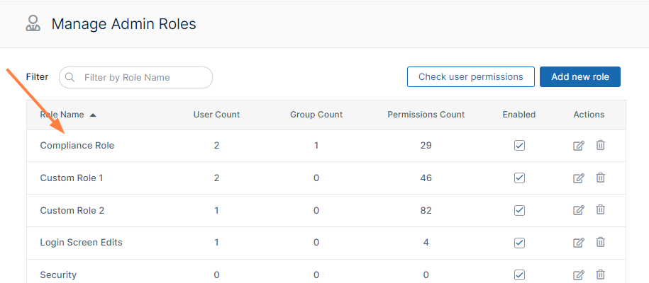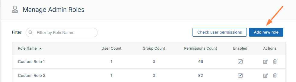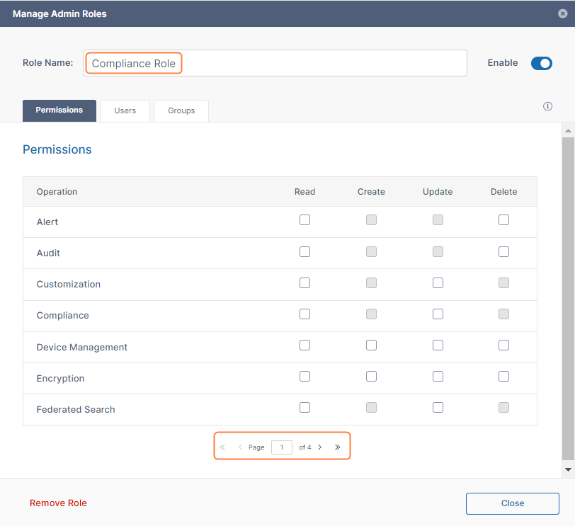 Click Close. The new role is listed on the page with its user, group, and permissions counts. It is enabled by default.