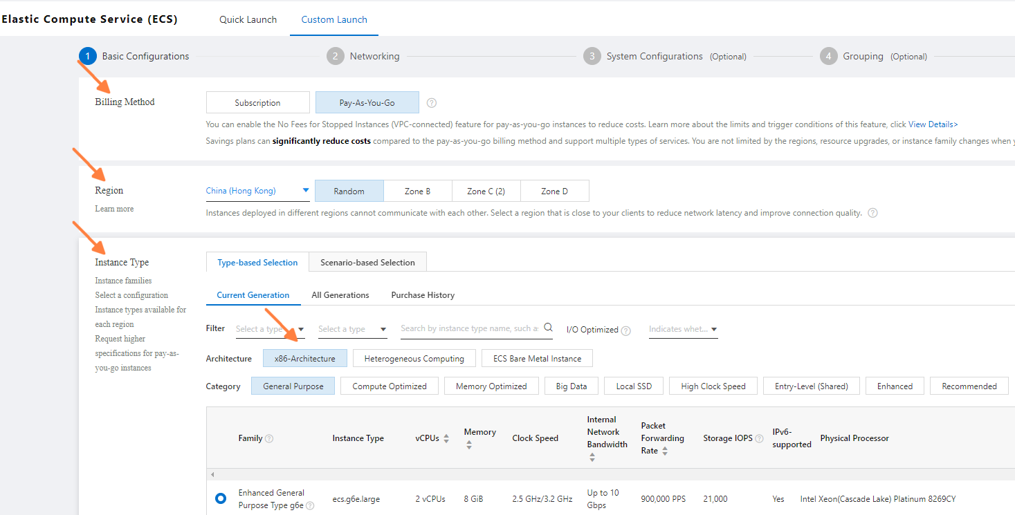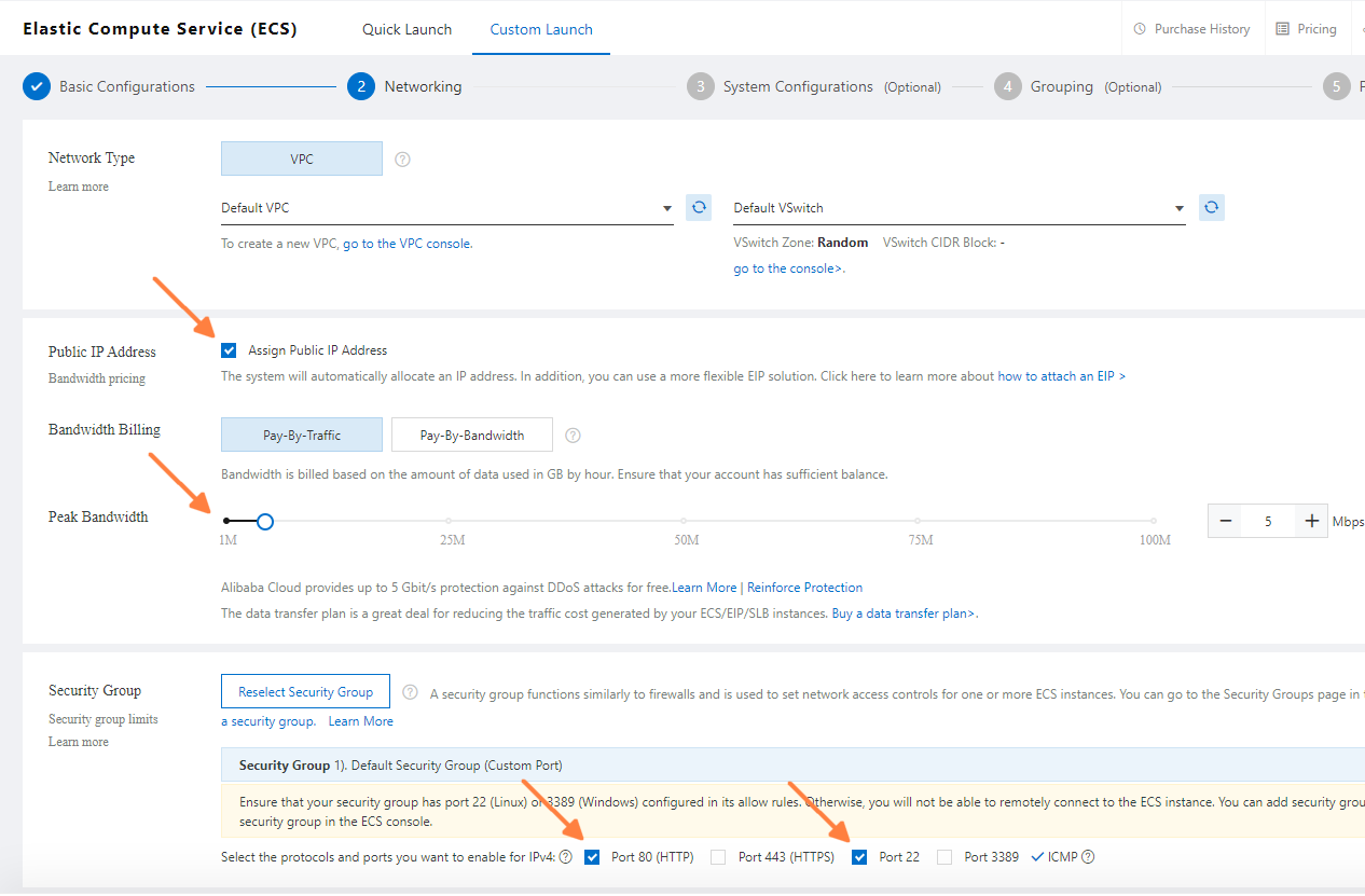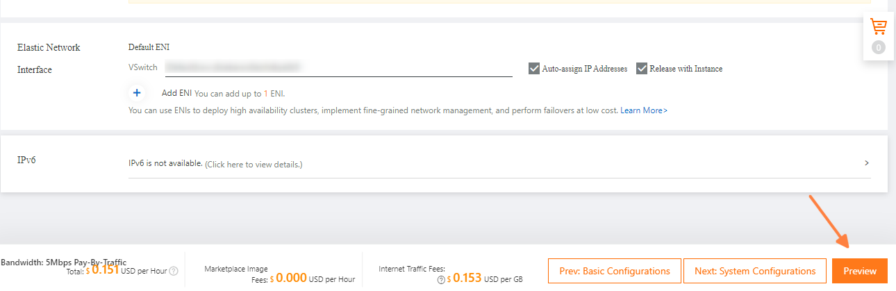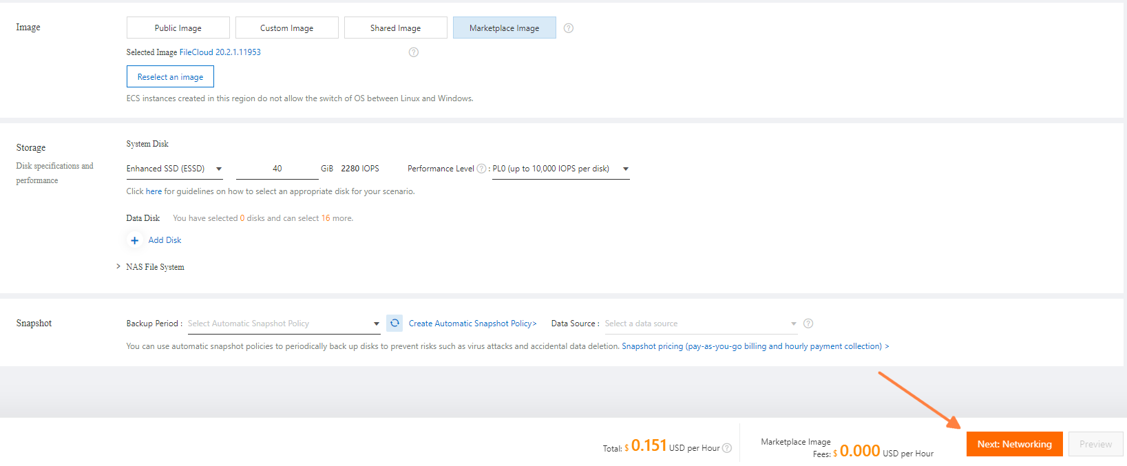 - Select the desired storage configuration (you can use the defaults provided by Alibaba), then click Next: Networking.