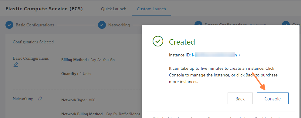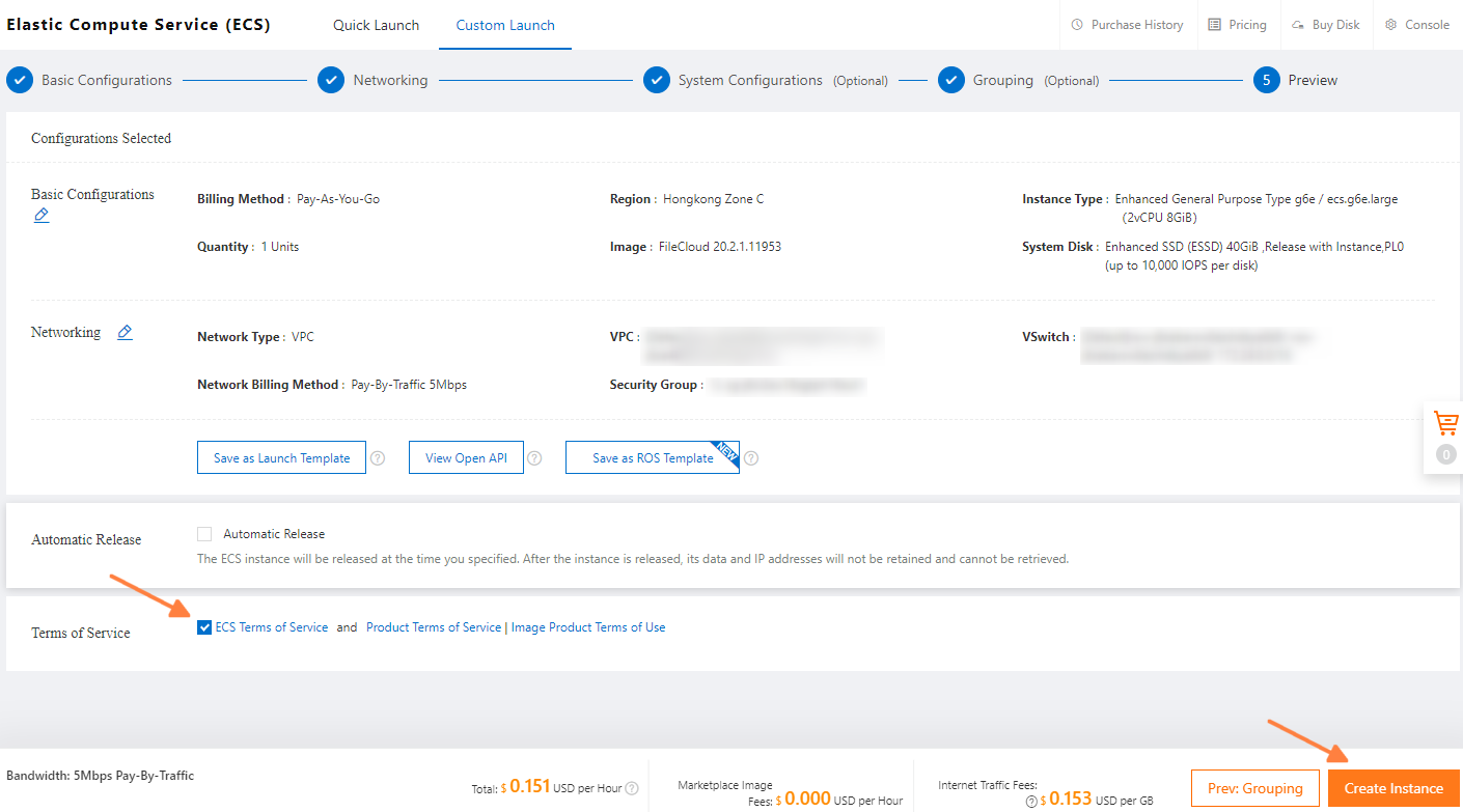 Check ECS Terms of Service, and click Create Instance to launch the instance.