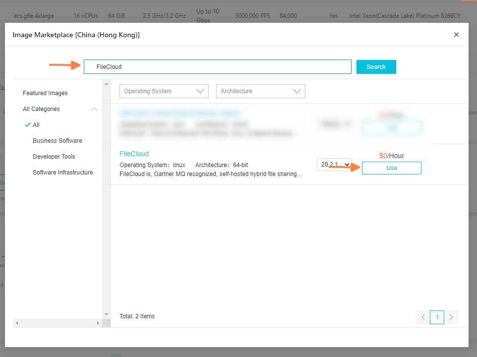 - In the Image Marketplace ... screen, search for FileCloud and click Use.