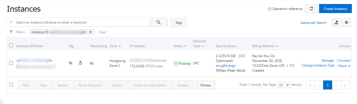 - Confirm that FileCloud is running in your Alibaba Instances dashboard. Please note the public IP Address and Instance ID to access your FileCloud server.