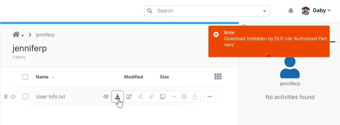 - Log in to the user portal as a user from the group "Company XYZ" from a public IP that is not allowed by the DLP rule. Confirm that file download is forbidden.