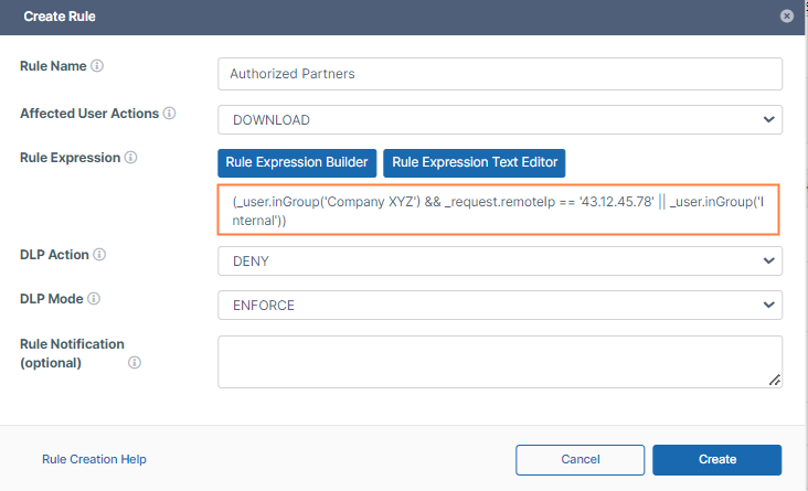 The purpose of this example is to create a Smart DLP rule that allows downloading of files from authorized partners of your company initiated from a specific public IP address or a list of public IP addresses.