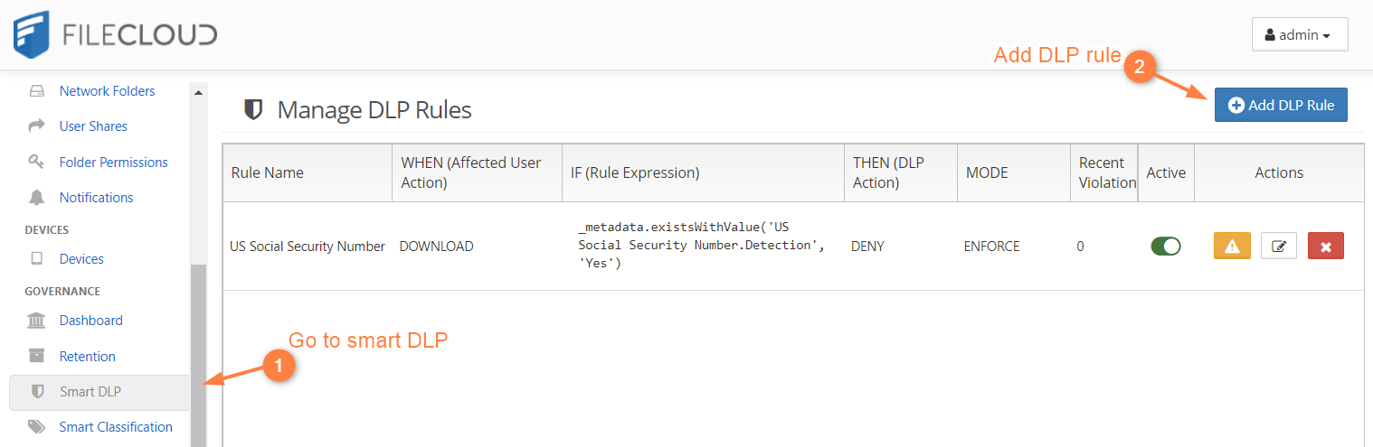 - Open the FileCloud Admin portal, and in the navigation panel, click Smart DLP.