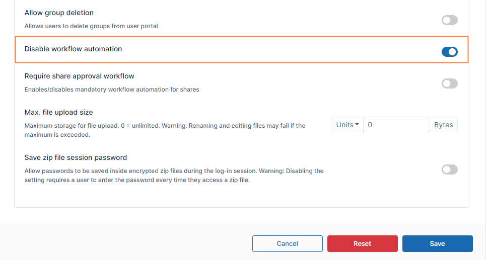 Automated Workflows enable users in the user portal to create automated processes, such as file approvals and file storage. By default the Automated Workflow function is enabled, but you can disable it.