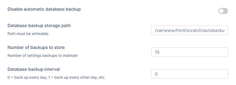 Disable automatic database backup- Enable to prevent database back up during a Cron run. When disabled, automatic backup runs, and the last automatic backup run date is displayed.