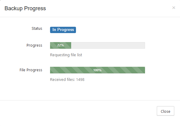 The progress of a backup job that is currently executing can be monitored from the web UI. If progress dialog opens automatically when a backup is scheduled to start immediately.