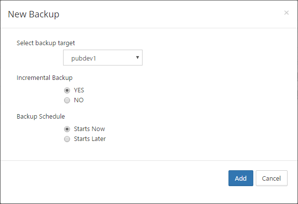 - Incremental Backup: Select 'Yes', if this backup has to be incremental. Note if the new backup is the first backup for the target, even selecting an incremental backup, will result in a full backup. The reason for this is that there are no existing backups available.