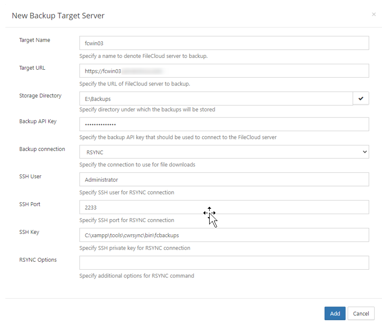 See Step 3 in FileCloud Backup Server Configuration for help navigating to the Settings > Target Server tab in the Backup Server user interface.
