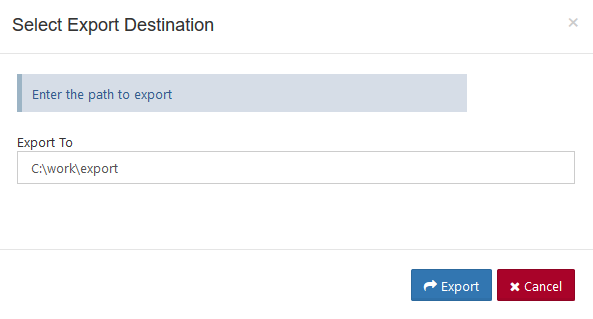 - Next prompt will require the local path where the exported folder/file(s) are to be stored. Enter a path with write access and click on 'Export' button. This will add the export request to the queue.
