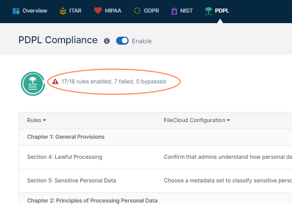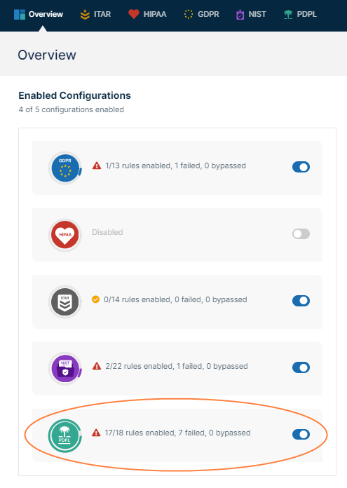 There are currently compliance tabs for ITAR, HIPAA, GDPR, NIST, and PDPL. Each tab lists the rules for the particular regulation and whether the system is compliant with each rule or has issues. You can enable or disable each rule, change the settings that are evaluated, and manually mark a rule as compliant in each tab.