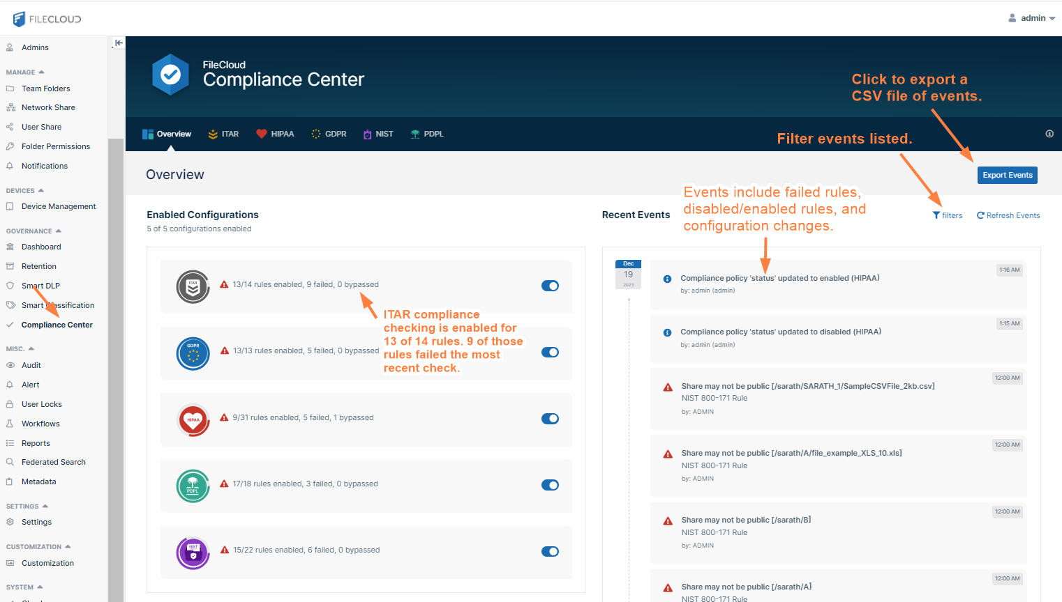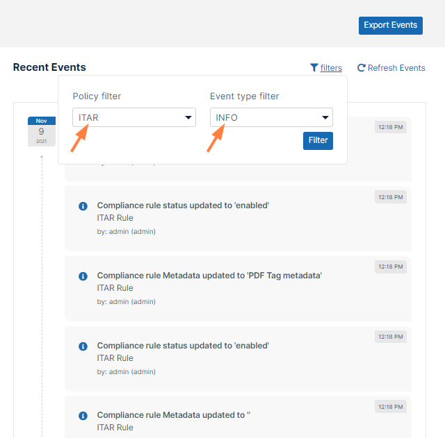 You can click filters above the Recent Events list to only display violation or information events, or to only display events for one compliance. In the following image, the filters are set so that only ITAR events that are informational appear.