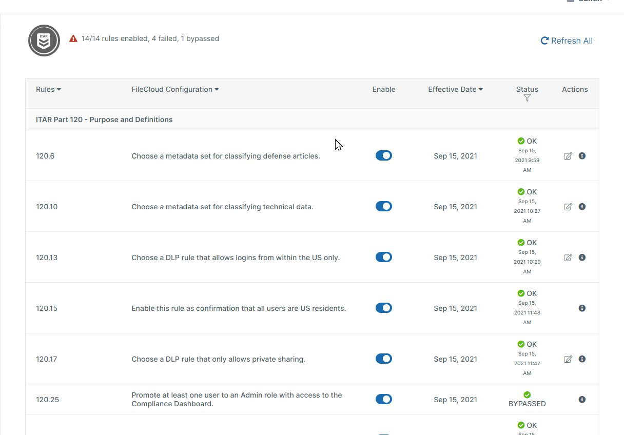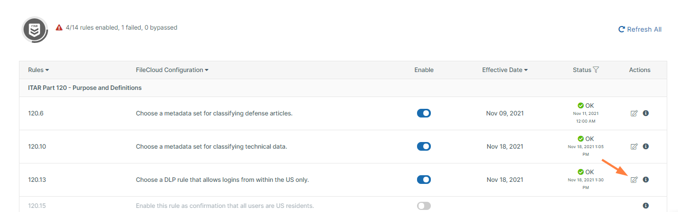 For basic information on how to comply with a rule, hover over the description under FileCloud Configuration. For more specific instructions, click the Information icon in the row for the rule. To see the text of the rule in the regulation document, click the rule number.