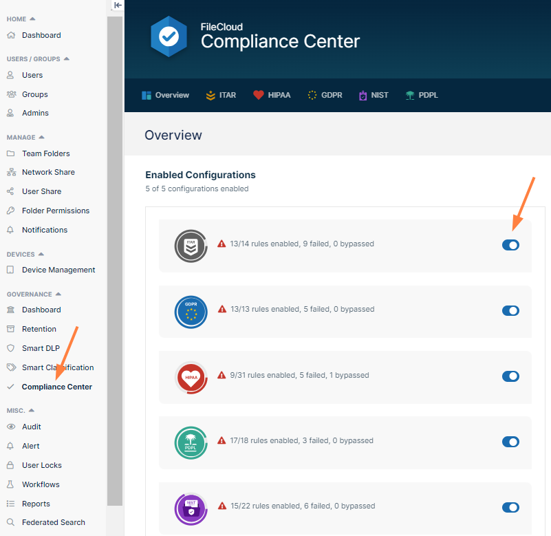 Either: Under Enabled Configurations, click the slider for a compliance.